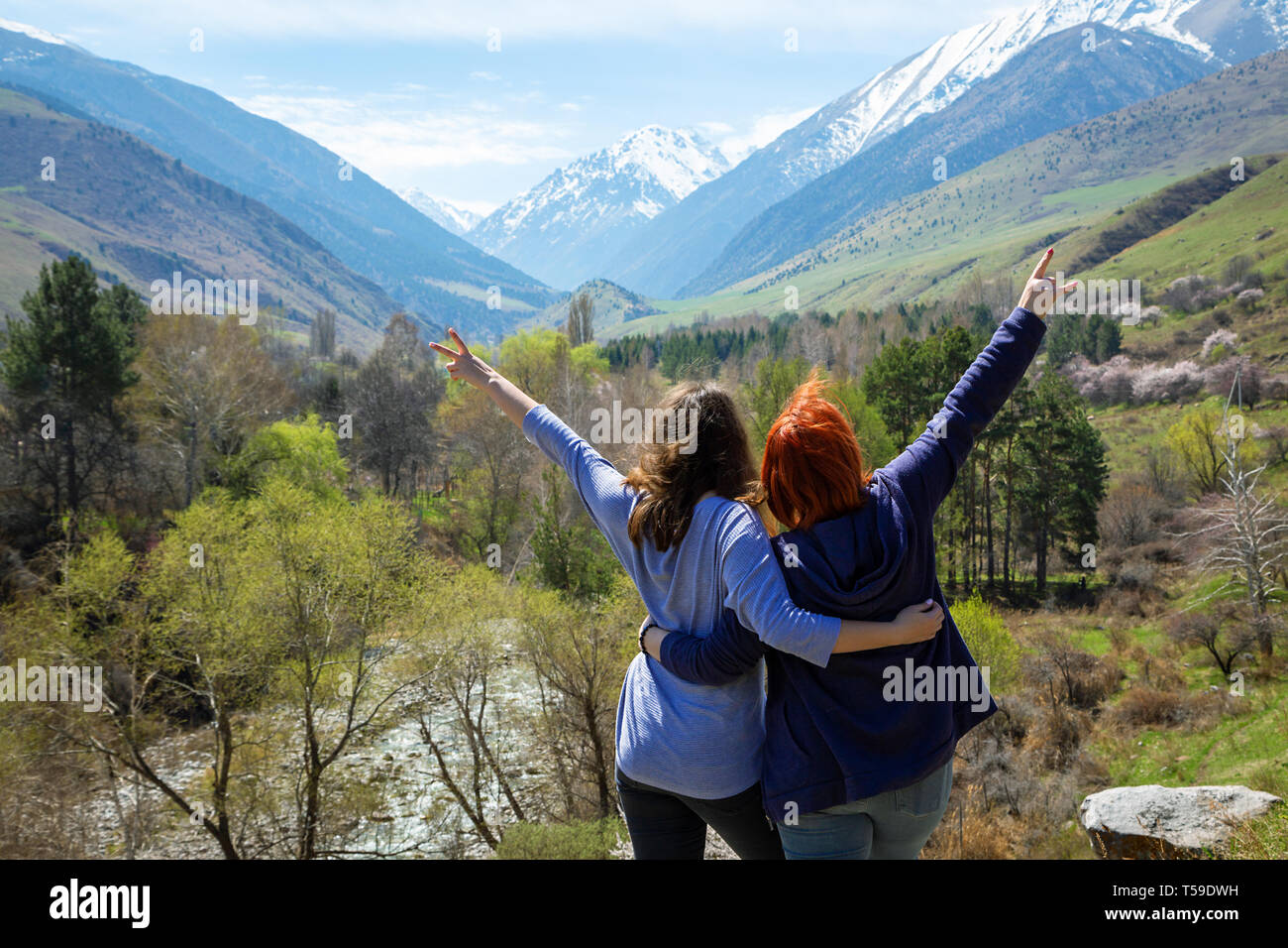 https://c8.alamy.com/comp/T59DWH/two-girls-happily-raise-their-hands-up-travelers-on-the-background-of-a-beautiful-mountain-gorge-high-snowy-mountains-and-green-trees-in-front-of-th-T59DWH.jpg